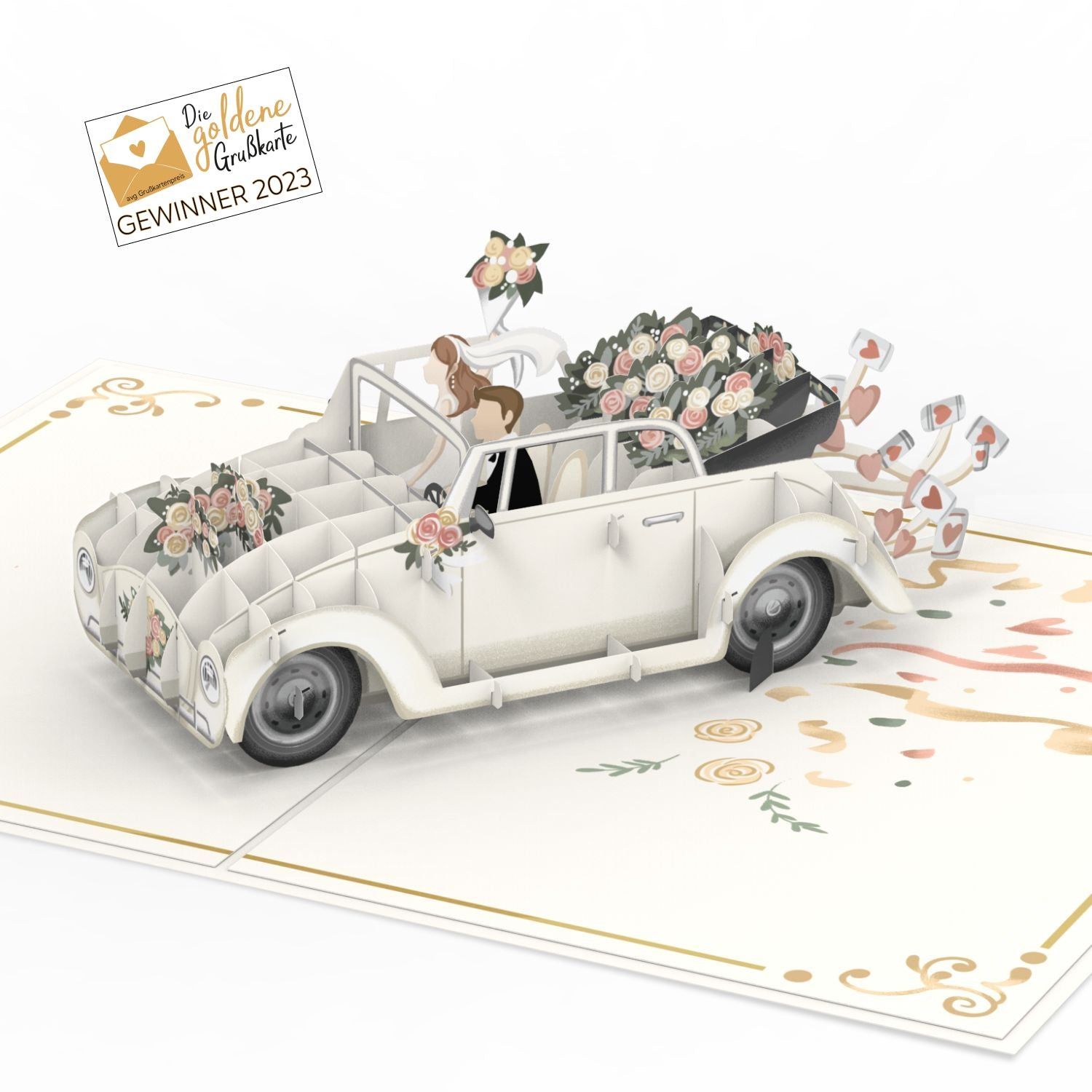 Handgemaakte pop-up kaart huwelijksauto met 3D-effecten! Bij het openen verschijnt een elegante auto in trouwstijl, versierd met een slinger en bloemen. De bruid en bruidegom stralen van blijdschap, terwijl de bruid haar boeket omhoog houdt. Aan de achterkant hangen klassieke blikjes en het bord "Just Married". De cover toont de versierde auto op een beige achtergrond met de inscriptie "Just Married". Deze unieke kaart is perfect als cadeau voor het bruidspaar of als bruiloftsgroet. Dankzij het pull-out invoegblad kunt u eenvoudig een boodschap of geld toevoegen. Afmetingen: 12 x 17,5 cm, inclusief een crèmekleurige envelop.